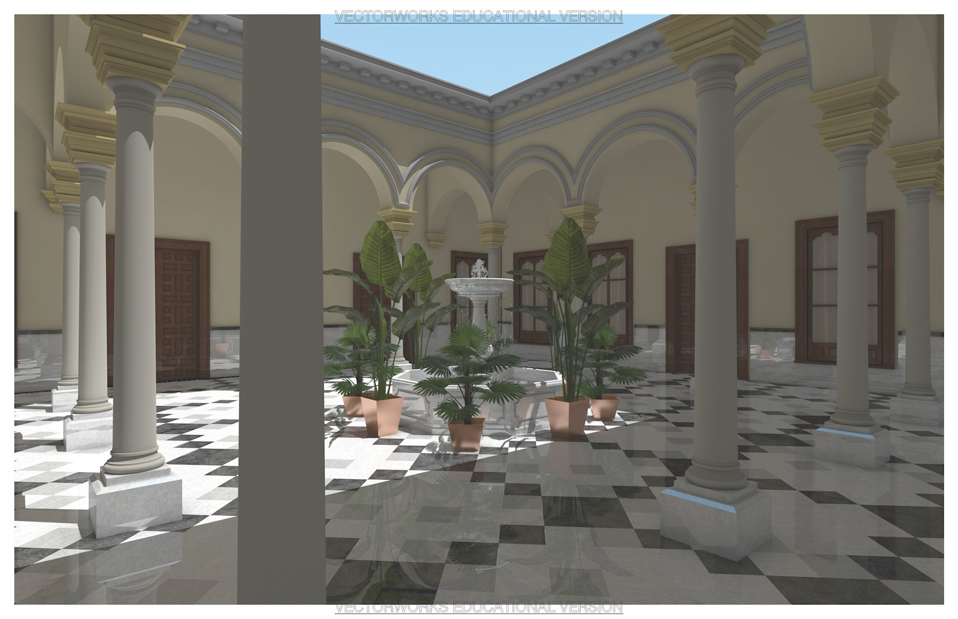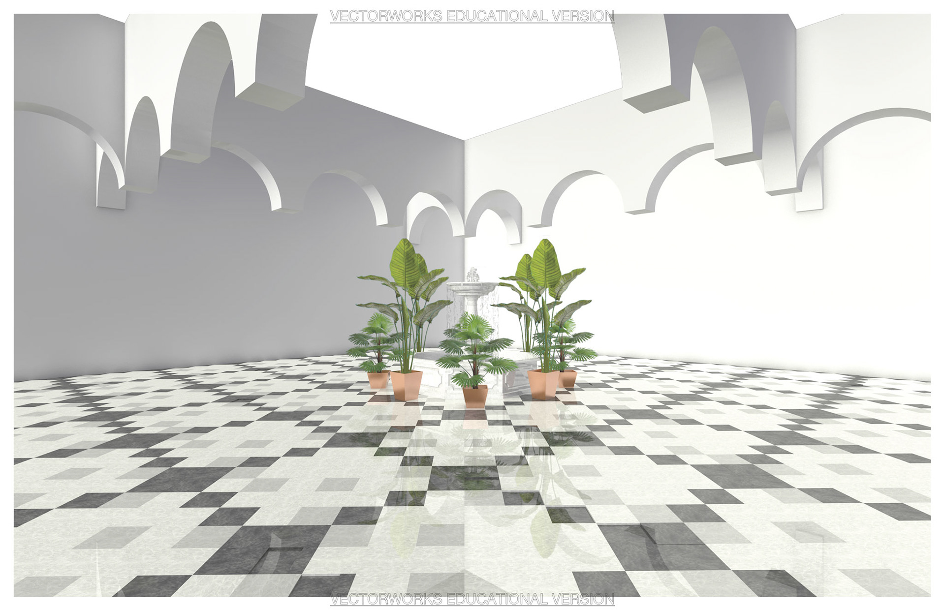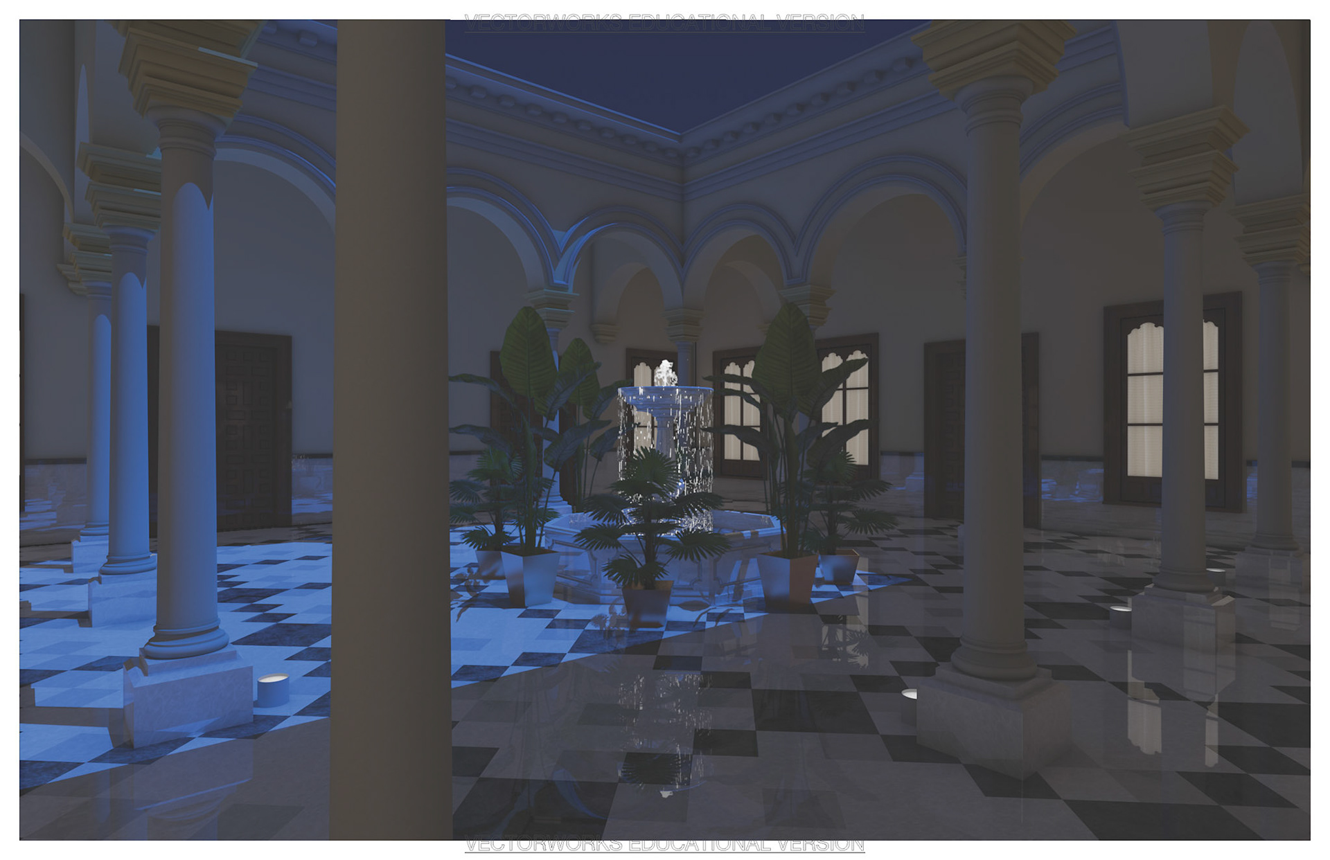 Fall 2024 // Render a hotel lobby including fountain, plants, and columns